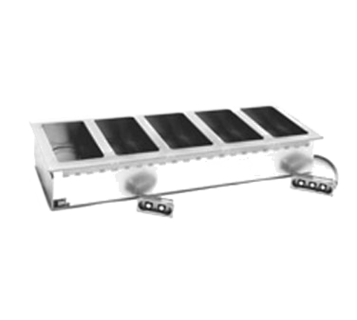 Drop-in Hot Food Well Unit, electric, dry operation, 76-9/16"W x 23-5/16"D cutout required for unit, (5) 12" x 20"Wells, 22/430 stainless steel top, 20 gauge galvanized body, (5) 750W exposed heating elements, fiberglass insulation on all sides, 8-3/8"W x 2-11/16"H cutout required for double control panel & 11-13/16"W x 2-11/16"H cutout required for triple control panel, infinite controls, control panel includes 20" flexible conduit, 3750W, 15.6 amps, 240v/60/1-ph, NSF