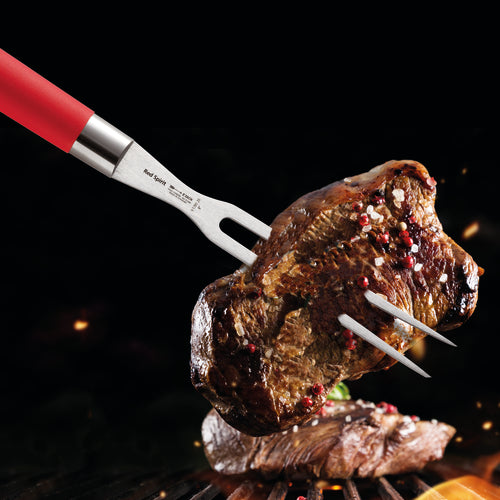 Red Spirit Fork, 8", hand wash, stainless steel bolster & heel, high carbon stainless steel blade, round non-slip red plastic handle