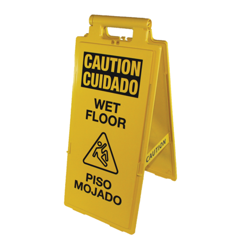 Floor Sign, "Caution Wet Floor/Cuidado Piso Mojado", 11"W x 13"D x 25"H, A-frame, with LockinArm locks, folds flat, plastic, yellow, Made in USA (minimum order = case quantity)