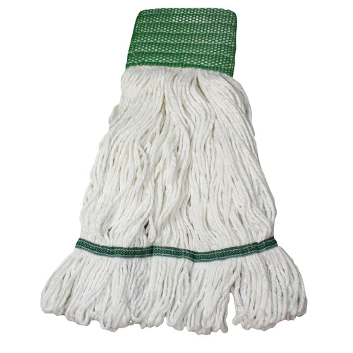 Wet Mop Head, medium, saddle-type, looped end, 5" vinyl coated mesh tailband, cotton/synthetic blend, natural/green, Made in USA (minimum order = case quantity)