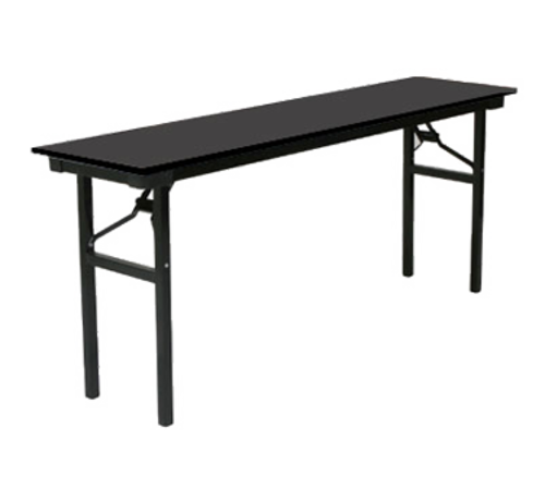 600 Series Training Folding Table, rectangular, 18" x 96" x 30"H, laminate surface, 3/4" thick plywood core, black vinyl "T" edge, 19 gauge 1-1/2" square steel tubing folding legs with black epoxy powdercoat finish, button/trigger lock mechanism, non-marking plastic glides