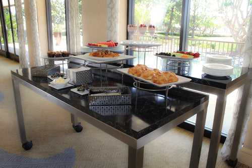 Claremont Series Nesting Tables (Executive), (4) tables: (1) large 72"W x 30"D x 40-1/4"H rectangle, (1) small 66"W x 30"D x 36-1/2"H rectangle, & (2) 30"W x 30"D x 44"H end tables, brushed stainless steel tube (2" square) frames with high pressure laminate tops, 4" swivel casters (2 with brakes)
