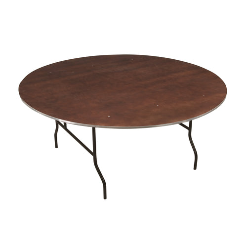 E Series Folding Table, round top, 60" dia. x 30"H, red mahogany stained surface, 3/4" plywood core top, through-bolted hardwood runners, 18 gauge galvanized steel edge, spring-bolt locking leg brace, 14 gauge, all-welded, wishbone legs, plastic leg glides