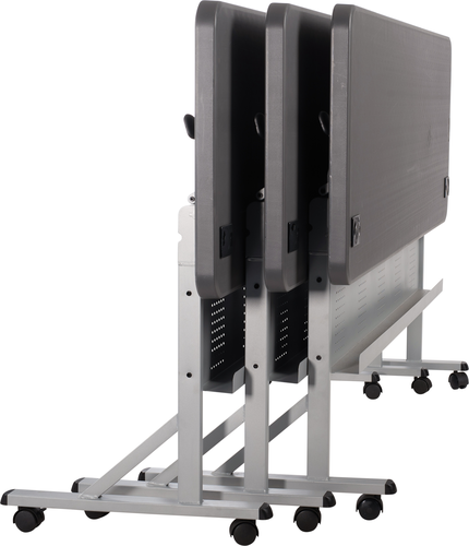 NPS® Flip-N-Store Training Table, 24" x 72", perforated steel modesty panel, 2 grommet holes, gray hammer-tone powder coated 2 levers, 16-gauge frame and legs, (4) 2" casters (2 locking), ANSI/BIFMA, MAS Green Certified