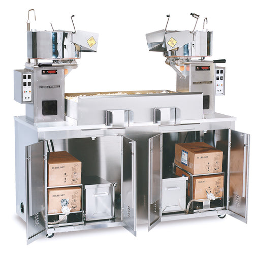 Twin Maxi Popcorn Plant, electric, floor model, (2) 48 oz. capacity Cornado units (left-hand dump & right-hand dump), stainless steel base cabinet, includes (2) wall receptacles, cULus, NSF