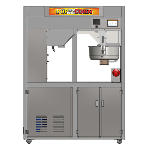 PopClean® Elite Popper™, 60"W x 33"D x 82-1/4"H, floor model, 32 oz. stainless steel kettle, reversible LED backlit sign, downdraft HEPA filtration system, built-in fire suppression, electronic control, kettle temperature/oil level indicator, multiple recipe selections, deep well popcorn storage, raw corn/supply storage, swivel casters, stainless steel construction, LED cabinet lighting, cETLus, ETL-Sanitation, EPA 202, NFPA 96