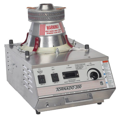Tornado® 200 Cotton Candy Machine, up to 6-7 servings per minute, (2) 7" stacked ribbon heat elements, automatic voltage control, 1/3 hp motor with sealed ball bearings, digital power percentage display, aluminum floss pan, 3120 watts, 208/230v/50/60/1-ph, NEMA 6-20P