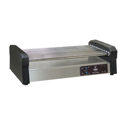 Hot Diggity® Pro X Roller Grill, large, (10) stainless steel rollers, one-touch controls, separate temperature controls for front & rear heat zones, adjustable cabinet can switch from flat to slanted (4° or 8°), includes stainless steel drip tray, stainless steel & painted aluminum cabinet, 1218 watts, 120v/60/1-ph, NEMA 5-15P, cULus, NSF