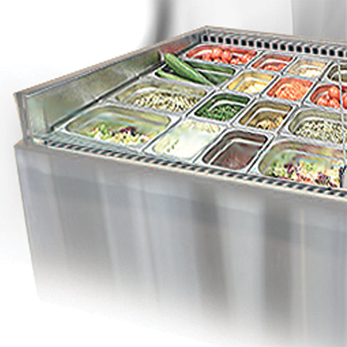 Vienna Air Pan Cold Food Serving Counter, 41-3/8"W, slide-in, self-contained refrigeration, forced air cooling system, slanted display, accommodates (14) cold pans, programmable digital controller, removable deck pans, front air-dam glass panel, lift-up evaporator, 304 stainless steel exterior, 1/3 HP, cETLus, ETL-Sanitation (Floor drain required)