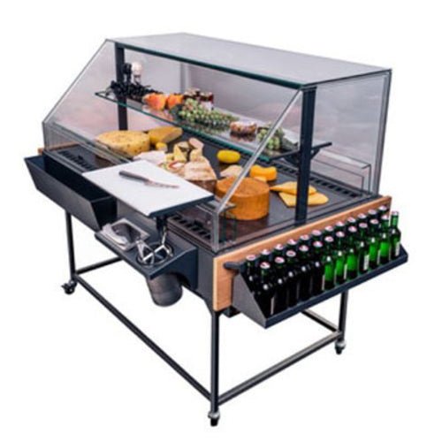 Vienna Series Papilio Cold Service Display, freestanding, 51-7/8"W, self-contained refrigeration, (1) tempered glass ambient shelf, LED lighting, programmable digital controller, removable deck pans, hot gas evaporation system, frameless insulated glass ends, tempered glass top & front, air cooled system with variable speed fan, rear breathing kit, operator accessory kit (includes: cutting board, knife scraper & 1/9 pan), stainless steel interior & exterior, locking casters, 1/2 HP, cETLus, ETL-Sanitation