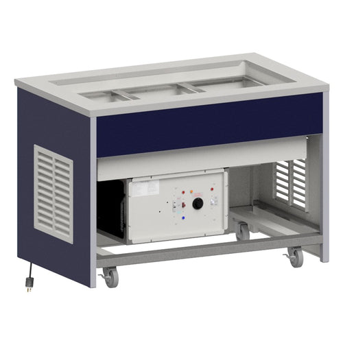 Mobile Hot/Cold Unit, 50-1/4"W, open cabinet base, (3) 12" x 20" pan capacity, hot/cold selector switch (hot operation requires water), 16/304 stainless steel top, stainless steel frame with laminate panels, NO undershelf, 5" swivel casters (2 with casters), UL EPH Classified