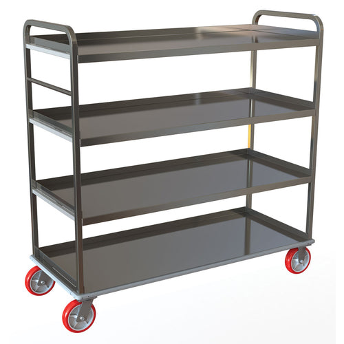 Queen Mary Banquet Cart, 69"W x 28"D x 70"H, (3) solid 304 stainless steel shelves, with reinforced lip design (three up and 1 down) and tubular reinforcement, push handle, continuous bumper, (4) 8" x 2" poly-U plate casters (2) rigid (2) swivel, fully welded stainless steel construction, NSF, Made in USA