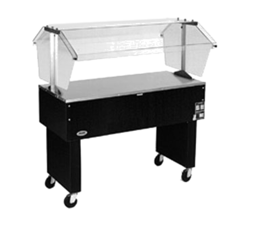 Deluxe Service Mate, Portable Solid Top Unit, 33"W, stainless steel top, steel wrapper/laminated black vinyl finish, clear double sided Tuffak® sneeze guard, open base, 4" casters (2 with brake), NSF