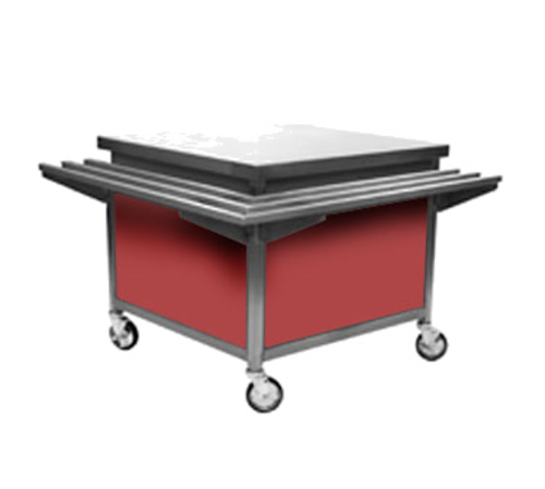 Director's Choice® Outside Corner Transition Unit, 34"H, 16/304 stainless steel top, welded 1-1/2" square tubular open base, laminated front panel holly berry red (Wilsonart D307-60) on 18 gauge galvanized sub-panel, 5" poly casters (2 with brakes), NSF
