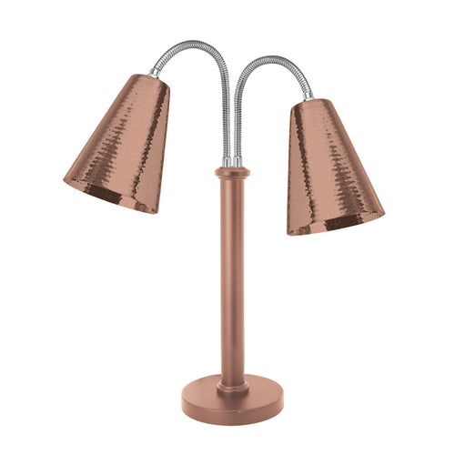 Lamp Warmer, double, self standing, (2) 250 watt type bulb, flexible lamp head, hammered conical shade, round base, single on/off switch, for carving station, stainless steel, XYLO copper finish with Anti-Microbial 24/7 germ-free surface coating, 120v/60/1-ph, 4.2 amps, NEMA 5-15P, 5 Star Series (made to order, non-returnable)