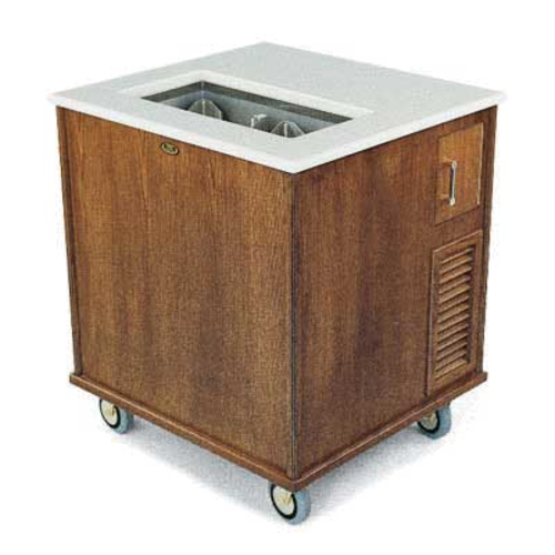 Plate Dispenser Cart, wood veneer cabinet, solid wood molding, Avonite top, (2) 12" dia. self-elevating shielded plate dispensers, refrigerated