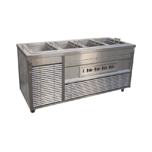 Hot/Cold Dual Operation Serving Counter, 68-3/4"W x 30-3/8"D x 31-1/2"H, 4-wells each accommodate (1) 12" x 20" pan, independent temperature controls, 3-way temp conversion switch per well (HOT/COLD/OFF), (4) pan lifting rings, stainless steel trim, galvanized body, side-mount self-contained refrigeration, (4) 3" plate non-marking swivel casters with brakes, cETLus, ETL-Sanitation (contact factory for price)