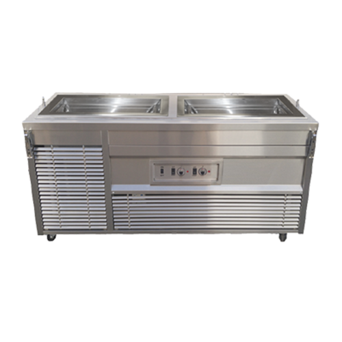 Hot/Cold Dual Operation Serving Counter, 78"W x 30-3/8"D x 34"H, 3-wells each accommodate (1) 12" x 20" pan, independent temperature controls, 3-way temp conversion switch per well (HOT/COLD/OFF), (3) pan lifting rings, stainless steel trim, galvanized body, side-mount self-contained refrigeration, 3" plate casters with brakes, cETLus, ETL-Sanitation (contact factory for price)