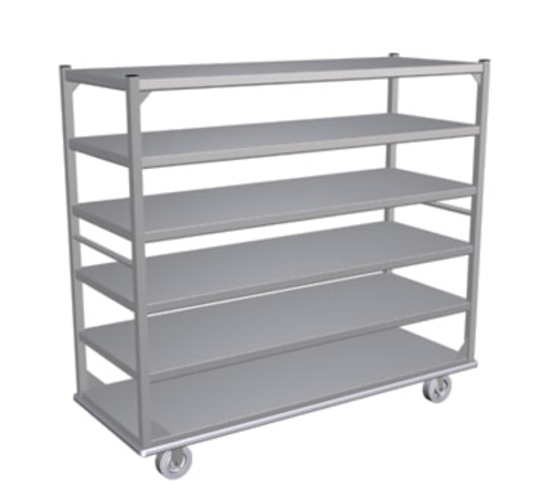 Queen Mary Cart, six open shelves (lip down all sides) with push handle, welded aluminum construction, (6) 27" x 72" shelves, 9-1/2" spacing, 8" x 2" high tech gray non-marking plate casters with precision bearings (2 rigid/2 swivel braked), 1500 lb. capacity, wrap around bumper