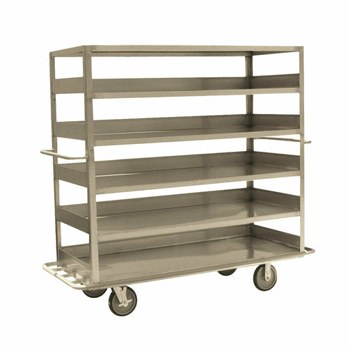 Queen Mary, heavy duty, (5) 27" x 63" shelves, 12-1/2" spacing between shelves, 4" turned up edges 3-sides (front edge down) on bottom & intermediate shelves, bottom shelf reinforced with 1/8" thick aluminum bolster channels, heavy duty all welded aluminum construction, (2) push handles, wrap around bumper, 8" poly casters with 2-swivel & 2-rigid, NSF, top shelf has all edges down