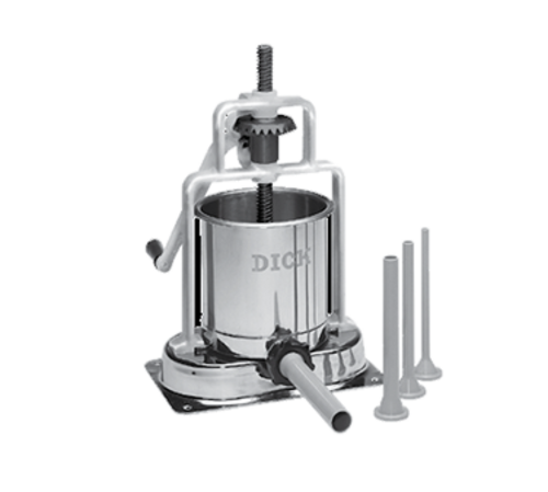 Sausage Stuffer Machine, 12 lbs (6 L) capacity, air-tight rubber seals and patented air valve, stainless steel gear box, cylinder, base plate and support rods, includes 4 plastic stuffing tubes (3/8", 1/2", 3/4", 1"), hand-wash only, Made in Germany