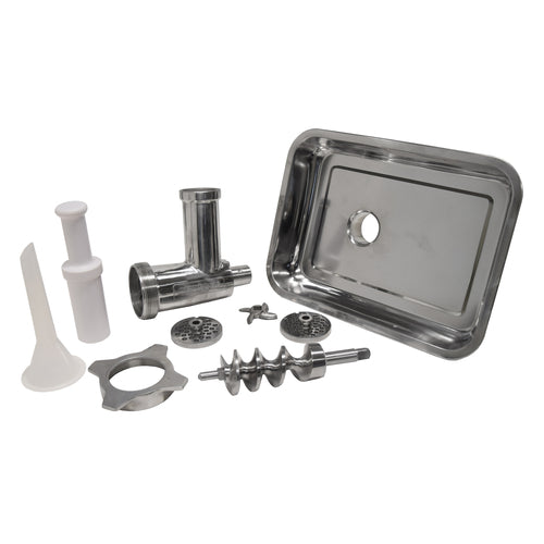 Meat Grinder, electric, bench type, #12 hub, 450 lbs./hour capacity, stainless steel feeder pan, meat pusher, 3/4" stuffer tube, (1) 1/4" plate, (1) 5/16" plate, stainless steel knife, forward/reverse switch, steel alloy gear driven transmission, permanently sealed lubricated motor, overload protection, reset button, stainless steel, rubber feet, 170 rpm, 1.5 HP, 115v/60/1-ph, 16.0 amps, CE, cETLus, ETL-Sanitation