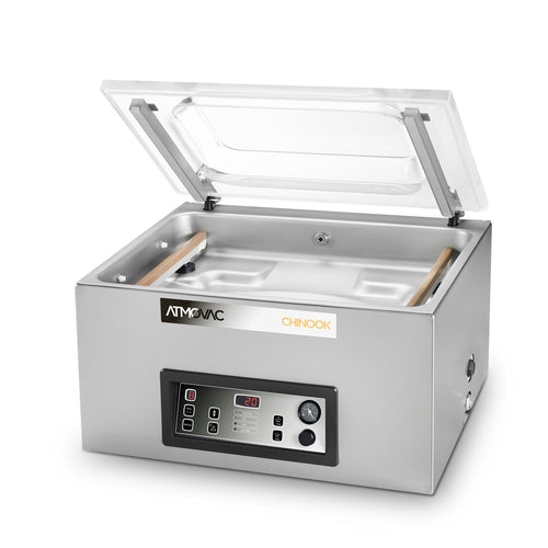 Chinook Vacuum Packaging Machine, electric, countertop unit, 16"W x 20.5"D x 7"H chamber, (2) 16" sealing bars, 21 m³h pump speed, sensor control, double seal, 20 programs, ACS, gate check (maintenance alarm), USB connection, printer compatibility, stainless steel, 1760 watts, 110v/60/1-ph, 16 amps, cord, NEMA 5-20P, HAACP Compliant, cETLus, NSF