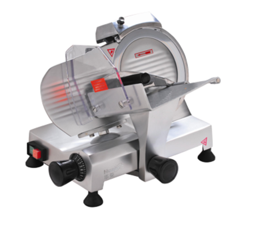 Meat Slicer, 9" blade, blade sharpener, belt drive, Perspex protector guard, waterproof and emergency shut off switch, anodized aluminum, 1.1 amps, 120 watts, 1/6 hp, cETLus, ETL-Sanitation