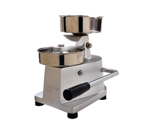 Hamburger Press, compact design, anodized aluminum alloy, stainless steel hamburger mold 5.12" diameter, built-in sheet holder included, rubber handle, 12-3/4"H x 10-3/4"W x 8-1/2"D