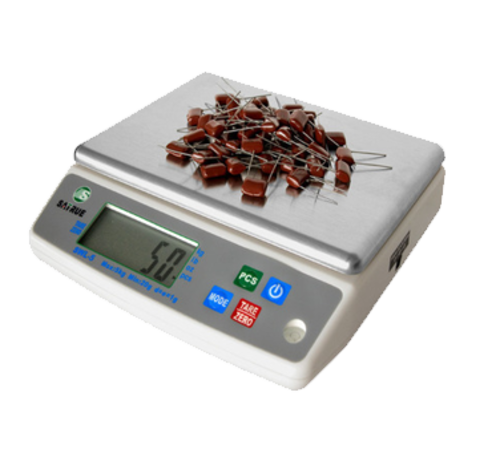 Weighing & Counting Scale, 3 kg (6.6 lb.) capacity, 0.5 g sensitivity, 9.5"W x 9.3"D platform, measures in kilograms, pounds, ounces & pieces, energy saving auto power off, auto back light. low battery /overload indicator, AC/DC 4.5v adaptor, uses (3) C batteries (not included), 110v