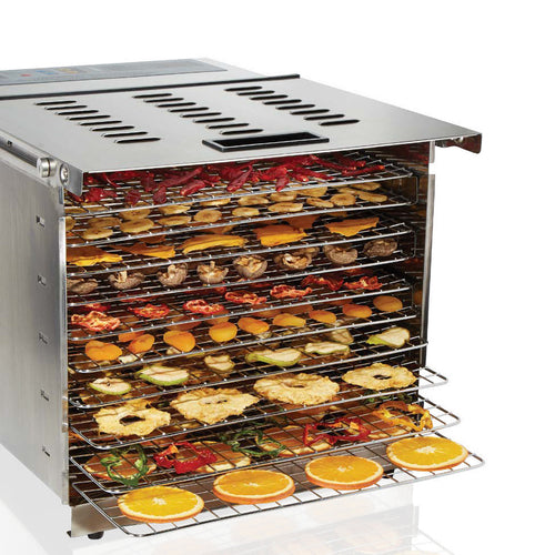 Proctor-Silex Commercial Food Dehydrator, 16 sq. ft. drying area, (10) tray capacity, digital controls with chart, horizontal airflow, auto shutoff timer, removable tray holders & fan screen, slide-back door, stainless steel construction, 1.2kW, 120v/60/1-ph, cETLus, NSF