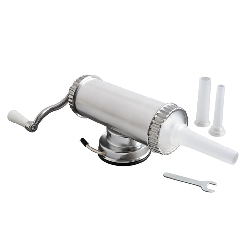 Fante's Uncle Attillo's Sausage Maker, 2.2lb capacity, 16-1/2" x 4" x 5", includes: (3) nozzles (15mm, 19mm & 22mm), instructions & recipes, disassembles for cleaning, suction base, aluminum and plastic, white