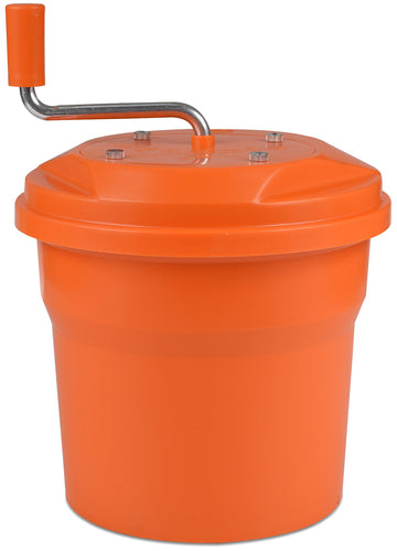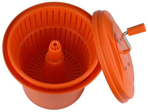 Dynamic Salad Dryer, 2-1/2 gallon capacity, 14" dia. x 16"H, accommodates 4 heads of lettuce, manual, includes outer bucket, interior basket and drain, plastic, orange, Made in France