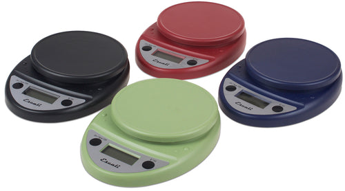 Escali Scale, 8"L x 6"W x 1-1/4"H overall, 6" round platform, 11 lbs. (5000 gram) capacity, measures in 0.1 ounce (1 gram) increments, compact, portable, digital, tare feature for resetting the scale back to zero, contents feature, automatic shut-off, (2) AA batteries (included), plastic, blue