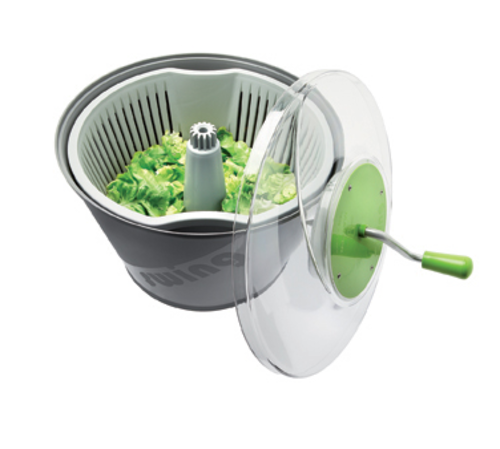 Matfer Swing Salad Spinner, 5 gallon, 18-1/8" dia., compact, swing handle, aerated basket, drainage tube, multiple gear system, transparent polycarbonate lid, polypropylene, made in France