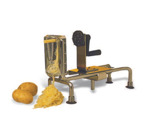 Le Rouet Vegetable Slicer, stainless steel housing and pusher, cast aluminum knife holder, includes two sets of 3 blades, 5/64", 1/8", 1/4", stainless steel clamp axle, tempered stainless steel straight, and fluted blades, made in France