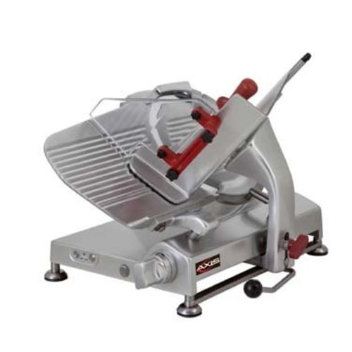 Axis Heavy Duty Meat Slicer, automatic, 13" carbon steel blade, gear driven, ring guard, dual action sharpening system, self-locking arm, slice thickness adjustment knob, up to 5/8" thick slices, noiseless operation, anodized aluminum construction, 0.60 HP, cord with NEMA 5-15P, 120v/60/1-ph, NSF, cETLus