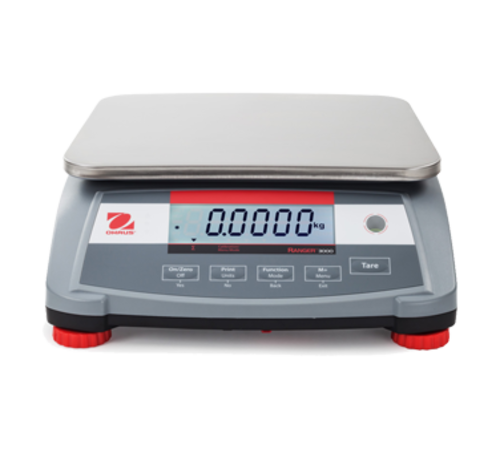 Ohaus® Ranger® Count 3000 Counting Scale, compact, bench style, 1.5 kg x 0.0005 kg/ 3 lb. x 0.001 lb./ 1500 g x 0.5 g/ 48 oz. x 0.02 oz., 8-9/10" x 11-4/5" stainless steel platform, (3) window backlit LCD display, (8) function keys, full numeric keypad, operating temperature: 14° to 104° F (-10° to 40° C), 30 item library data storage function, count, application modes: weighing, parts counting, check counting/weighing & accumulation, rapid stabilization, overload/underload indicator, up front level indicator, low battery indicator, auto shut-off, built-in RS232 interface, adjustable leveling feet, carrying handle, internal universal power supply, rechargeable lead acid battery (210 hours), plastic housing, 100-240v/50/60/1-ph, NTEP