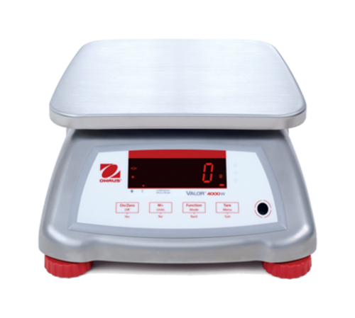 Ohaus® Valor® 4000 Compact Bench Scale, 30 lb. x 0.005lb, 480 oz. x 0.1 oz., 15 kg x 0.002 kg, 15000 g x 2 g, 7-1/2" x 9-1/2" stainless steel platform, stainless steel & ABS plastic housing, front & rear LED displays, 4 mechanical switches with rear touchless sensors, operating temperature range: 14° to 104° F (-10° to 40° C), user-friendly menu & setup, application modes: weighing, check weighing (3 LED lights), percent & accumulation, puncture resistant keypads, water resistant, AC adapter 12V DC, 50-hour internal rechargeable lead acid battery, non-slip leveling rubber feet, carrying handle, USDA-AMS, HACCP, NTEP, NSF