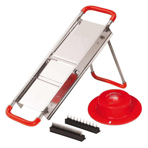 Chef's French Mandoline, 15-7/8"L x 4-1/2"W x 1-5/8"H, 9-1/2"H standing height, 3 stainless steel blades, two removable julienne blades: 1/8" and 3/8" spacing and one straight blade for slicing, protective skid resistant sleeve on handle and stand, Paderno, Tools & Utensils
