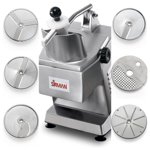 (40752558W6) TM A6 Food Processor with 6-Pack Plates, electric, continuous feed operation, belt driven, yields up to 7 lbs. per minute, dual interlock safety system, aluminum tilt-hopper lid, slotted drop-in drive, (2) feed chutes, removable cover & ejector blade, fan-cooled motor, stainless steel & polished aluminum construction, 3/4 HP, 515 watt, ETL, 120v/60, 4.29 amps, Plates Pack includes: 1/16", 5/32", 3/16", 3/8" slicers, 1/8" shredder, 3/8" dicer, ETL, ETL-Sanitation