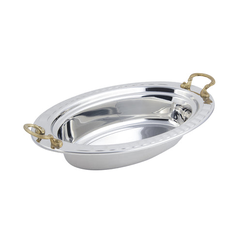 Food Pan, full oval, 6-1/8 qt. (196 oz.) capacity, 19" x 11-13/16" x 3-1/2", with round handles, heavy gauge high polished stainless steel, vapor steam lock shoulder, Arches design, NSF, UL