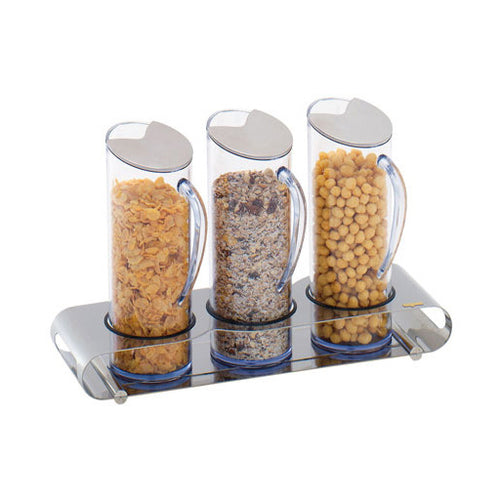 Frilich® Elegance Muesli Bar Trio, 18-1/2"W x 11-2/5"D x 5-1/2"H, includes: (3) 50.7 oz. (1.6 qt. / 1.5 liter) Cereal/Dry food containers with stainless steel press on lids and "good night" lids, stainless steel base, dishwasher safe acrylic containers (special order, contact G.E.T. for lead time & minimum order quantity)