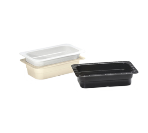 Food Pan/Insert Pan, GN 1/4 size, 10.36" x 6.3" x 2-1/2" deep, conform to Gastronorm specs & fit standard 12" x 20" opening, for cold application only, break-resistant, dishwasher safe, melamine, black, NSF