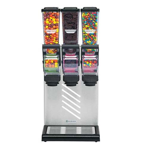 SLMDFD, SLIMLINE™ DRY FOOD & CANDY DISPENSER, triple, countertop, (3) clear-view copolyester 1.4 L (47 oz.) hoppers displays contents & level, dispenses a preset portion in 1/2, 3/4, 1 or 1-1/2 oz. portions, with stainless steel countertop stand, BPA free, ADA compliant (does not require a twisting wrist motion or tight grasping to dispense), NSF