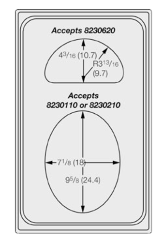 Miramar™ Template, for oval & 1/2 oval decorative pans, stainless/satin finish edge, accommodates (1) 8230110 or (1) 8230210 & (1) 8230620 oval pans, durable 12 gauge stainless, for hot or cold applications, dishwasher safe, integral corner design on bottom to ensure secure fit in well opening, fits all standard 12" x 20" hot/cold wells, warmers & chafers, NSF, Made in USA (contact Vollrath for lead time), made to order, cannot be cancelled or returned