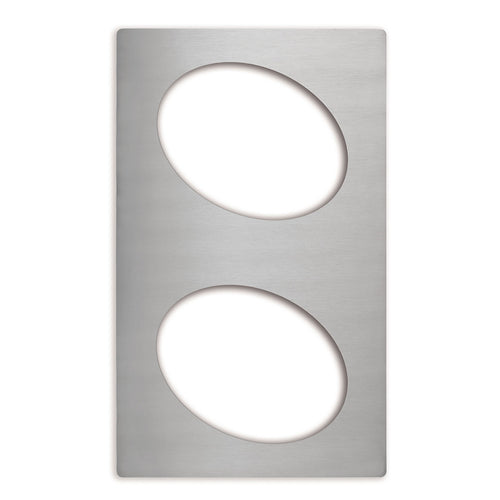 Miramar™ Template, for (2) small oval decorative pans, plain stainless, accommodates (2) 8230110 or (2) 8230210 oval pans, durable 12 gauge stainless, for hot or cold applications, dishwasher safe, integral corner design on bottom to ensure secure fit in well opening, fits all standard 12" x 20" hot/cold wells, warmers & chafers, NSF, Made in USA (contact Vollrath for lead time), made to order, cannot be cancelled or returned