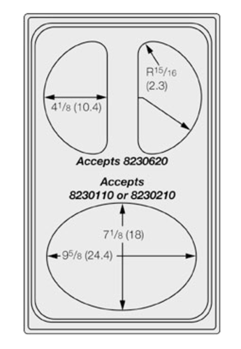 Miramar™ Template, for (1) oval & (2) half oval decorative pans, night sky color, accommodates (1) 8230110 or (1) 8230210 & (2) 8230620 pans, durable FDA approved thermostat resin construction, for hot or cold applications, heat resistant to 300°F (148.8°C), dishwasher safe, underside integral rib design for extra strength & securing template in well, fits all standard 12" x 20" hot/cold wells, warmers & chafers, NSF, Made in USA (contact Vollrath for lead time), made to order, cannot be cancelled or returned