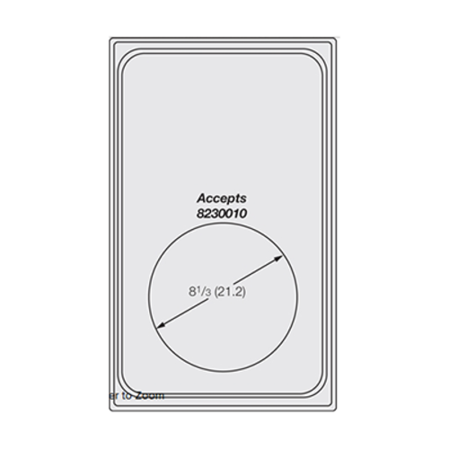 Miramar™ Template, for (1) medium round decorative pan, plain stainless, accommodates (1) 8230010 round pan, durable 12 gauge stainless, for hot or cold applications, dishwasher safe, integral corner design on bottom to ensure secure fit in well opening, fits all standard 12" x 20" hot/cold wells, warmers & chafers, NSF, Made in USA (contact Vollrath for lead time), made to order, cannot be cancelled or returned