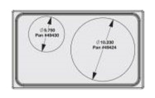 Miramar™ Single Size Template for Miramar™ Cookware, stainless steel plain edge, (1) large & (1) small round cutout, accommodates (1) 49430 Butter Warmer & (1) 49424 10" French omelet pan, overall dimension 21-1/8" x 12-3/4", NSF, Made in USA (contact Vollrath for lead time)